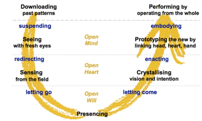 Otto Scharmer’s emerging future concept elevates these ideas into a collective dimension, urging us to “lead from the future” rather than the past. Theory U’s U-shaped process downloading old patterns, suspending judgment, presencing at the bottom, and crystallizing new prototypes mirrors the entropy-reduction journey. The descent involves confronting entropy: letting go of high-disorder habits (Stoic non-reaction), addressing unmet needs (Maslow), and reconnecting with suppressed forces (Stutz). At the “U’s” nadir, presencing connects to emerging potentials, akin to accessing Campbell’s higher consciousness or Stutz’s higher forces, where low-entropy insights arise that foster transcendence and often, this deep presence evokes flow, with its immersion and timelessness enables creative breakthroughs.