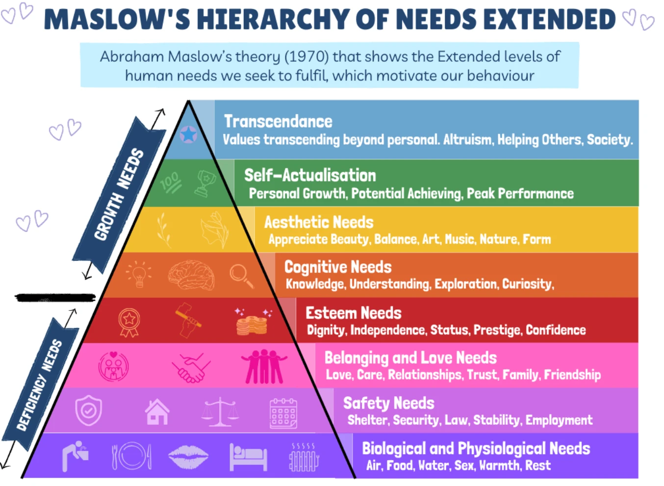 Abraham Maslow’s Hierarchy of Needs is a motivational theory depicted as a pyramid of human requirements, progressing from basic to advanced levels. At the base are physiological needs (food, water, shelter, sleep). Next is safety (security, stability). Then comes love and belonging (relationships, intimacy). Followed by esteem (respect, achievement). At the apex is self-actualization, where individuals realize their full potential, pursue personal growth and achieve peak experiences. Later in his work, Maslow expanded the hierarchy to include self-transcendence as the highest level, involving going beyond the self through altruism, spirituality, peak experiences that connect to a greater whole, and contributing to causes larger than oneself. Maslow posited that lower needs must generally be satisfied before higher ones motivate behavior, though the hierarchy is flexible and influenced by cultural and individual factors.
